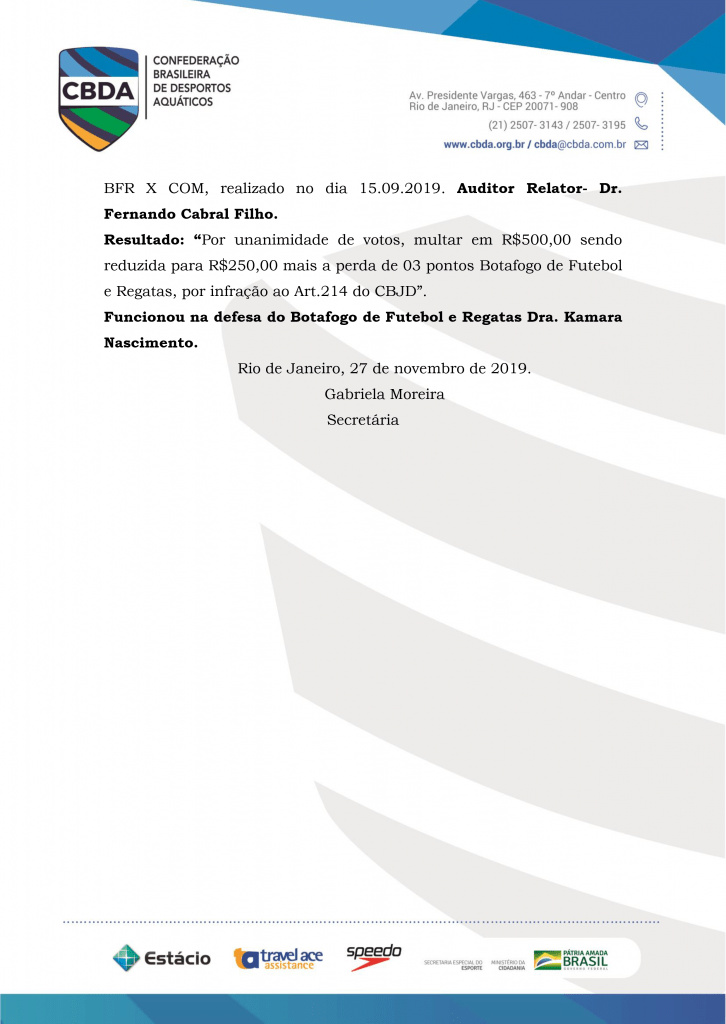 Por decisão do STJD, julgado na data de ontem (27/11/19), o Botafogo perde 3 pontos na classificação da Liga Nacional PAB 2019.